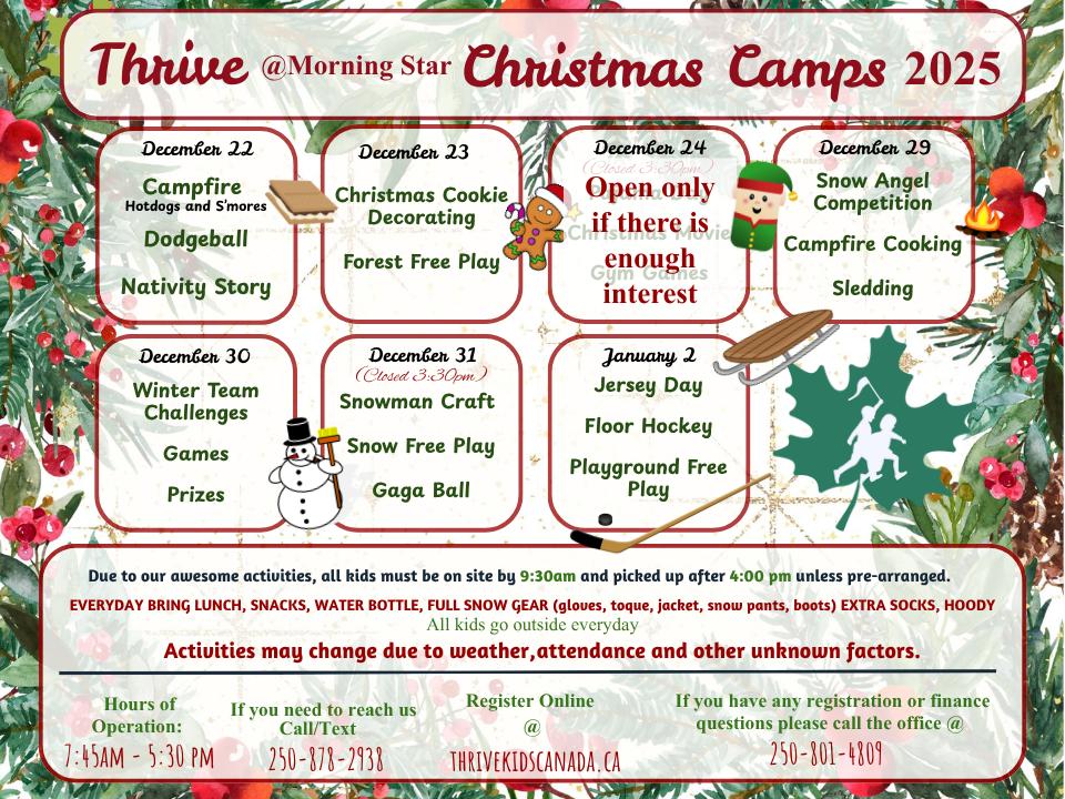 We are excited to have a fun filled Christmas Camp with activities where we explore parks, and many entertainment spots around the area. Scheduled activities may change due to availabilities.